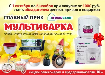 В сети магазинов «ПРОРОСТ» с 1 октября по 6 ноября проходит акция, в ходе которой будут разыгрываться ценные подарки: МУЛЬТИВАРКА, посуда, светильники, кашпо, садовые фигурки и многое другое.