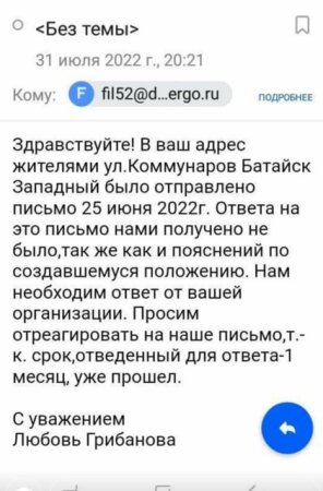 С той поры прошло полтора месяца, батайчане написали повторное обращение, датированное уже 31 июля. Но на обе жалобы ответа так и не дождались.
