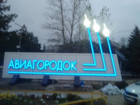 Массивная конструкция с надписью "Авиагородок" существовала здесь и раньше, однако за последние годы сильно обветшала - искрошилось бетонное основание, потеряли вид буквы. После ремонта стела модернизирована и стала практически новым объектом. Надпись и символические три самолета на ней теперь снабжены подсветкой, так что в ночное время композиция теперь более заметна.