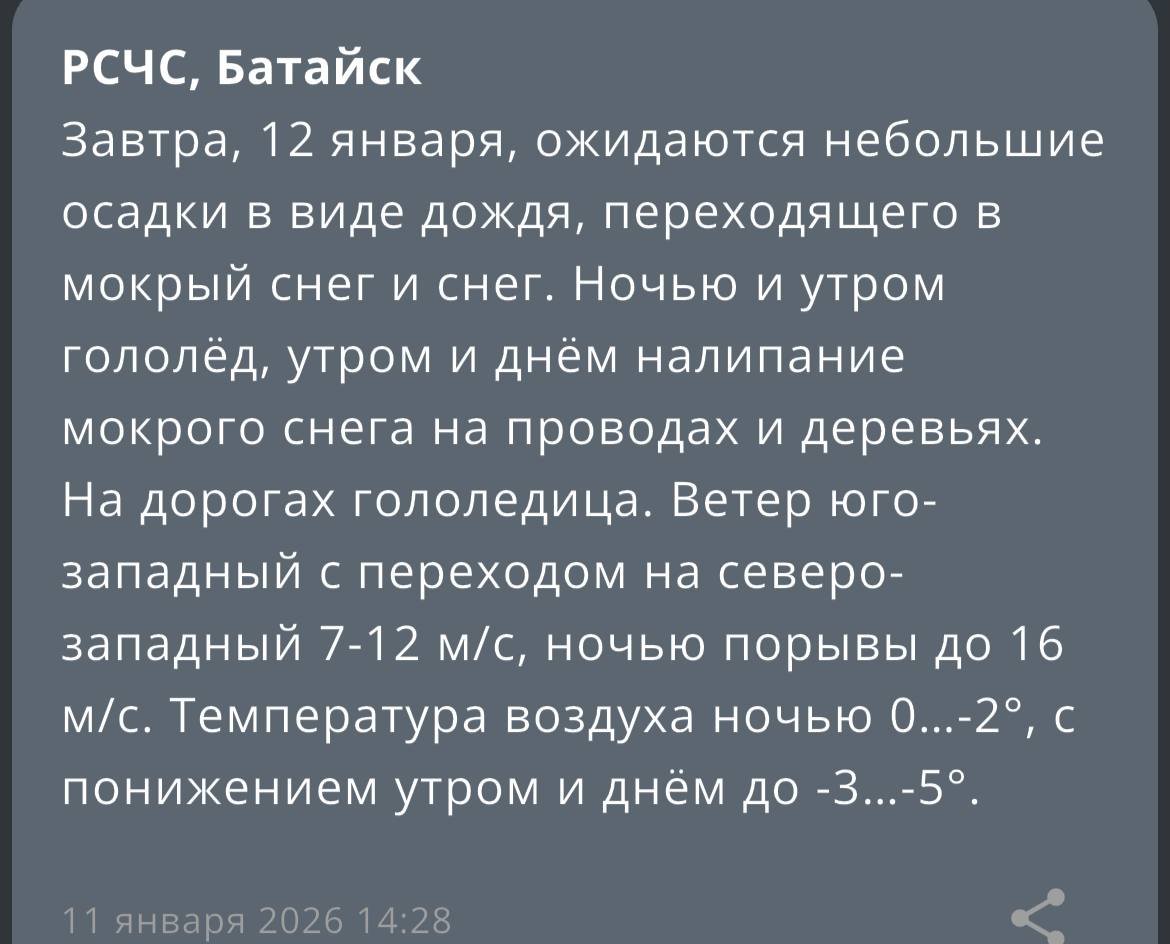 Батайчан предупреждают о непогоде 12 января. Об этом сообщает РСЧС днем 11 января.