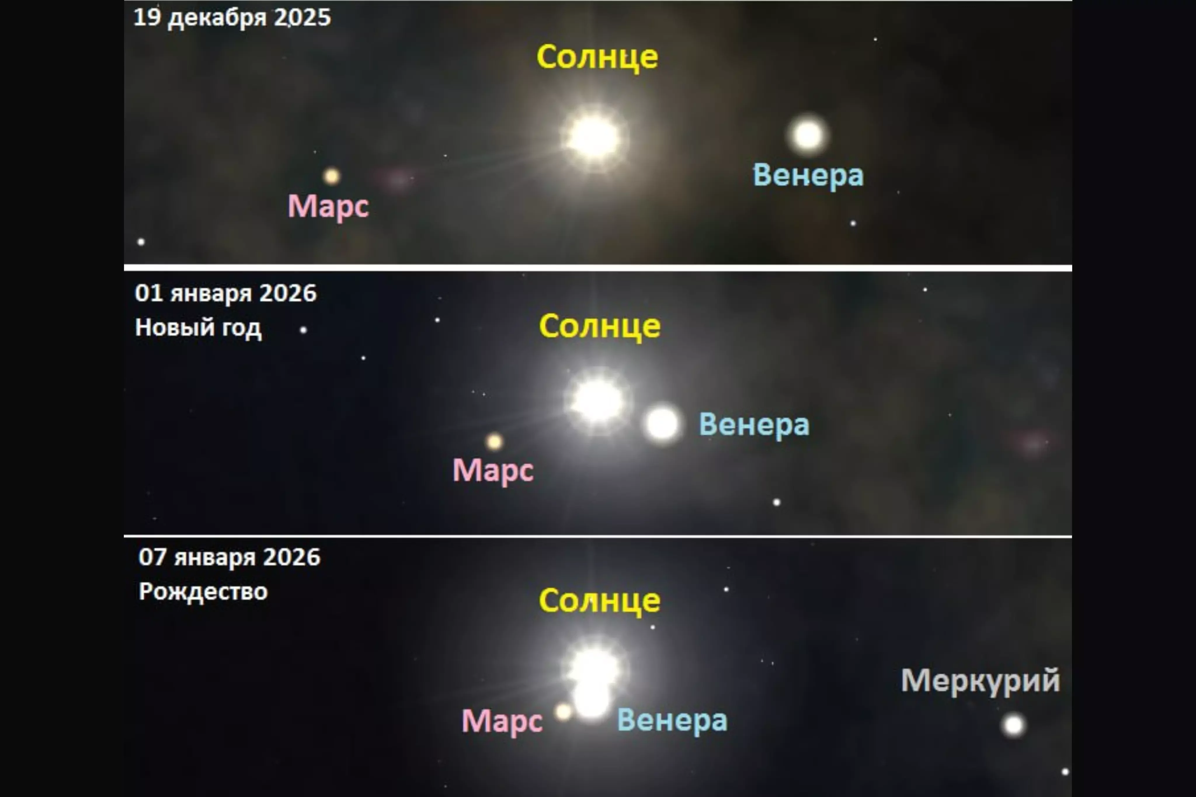 — В течение 7 января на небе соединятся с Солнцем две соседние с Землей планеты — Венера и Марс, которые к концу дня выстроятся примерно в одну линию с Солнцем, образуя своеобразную Вифлеемскую звезду, — сообщают ученые.