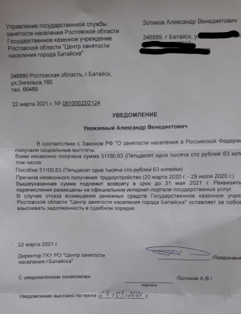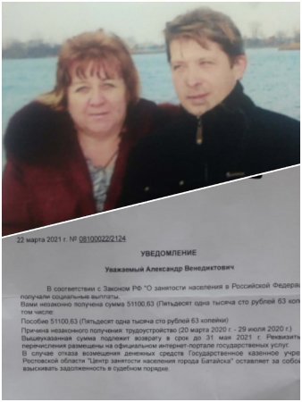 - Нам пришло «письмо счастья», и у меня прединфарктное состояние, - поделилась Алла Анатольевна – С моего мужа в ультимативной форме требуют более 50 тысяч рублей, которые он якобы незаконно получил в виде пособия по безработице. Но мы таких денег даже не видели!