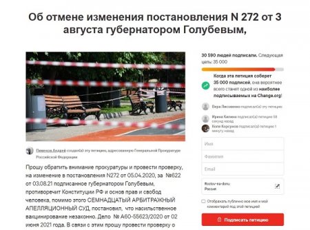 За минувшие сутки петицию за отмену коронавирусных ограничений в Ростовской области подписало почти 15 000 человек. На момент публикации 6 августа счетчик количества подписей показывал 30 590.