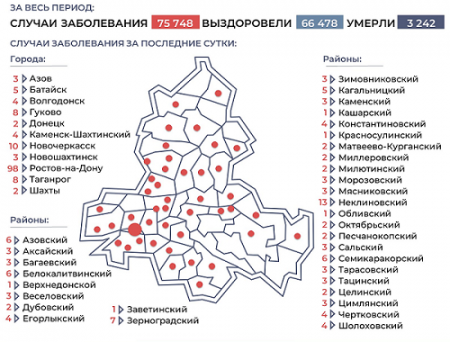 Новые случаи коронавируса зафиксированы в 44 городах и районах. На первом месте антирейтинга снова областной центр - в Ростове за сутки прибавилось 98 заболевших. Далее следуют Неклиновский район (13), Новочеркасск (10), Гуково (8), Таганрог (8), Зерноградский (7), Азовский (6), Белокалитвинский (6), Семикаракорский (6) районы. В Батайске за сутки коронавирус подтвердился у пяти человек.