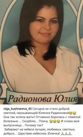 - Сегодня не стало доброй, светлой, неунывающей Юлечки Радионовой. Она так хотела жить! Отчаянно боролась с тяжелой болезнью. Скорблю, плачу. И снова моя выпускница. Почему так?.. Забирают на небеса лучших, любимых, светлых, добрых. Царствие небесное, Юлечка, - написала 7 марта ее школьная учительница Ольга Кушнарева.