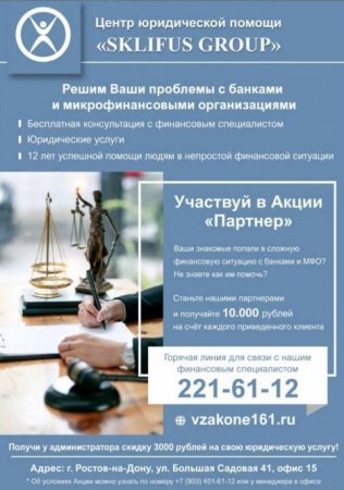 Центр юридической помощи «Sklifus Group» работает в Ростове и Азове вот уже 12 лет. За это время сотни людей получили здесь квалифицированную помощь и смогли избавиться от накопившихся долгов. В скором времени филиал центра откроется и в Батайске, но уже сейчас услуги «Sklifus Group» доступны горожанам. И даже из дома выходить не нужно. Все что нужно это позвонить по горячей линии 221-61-12 или +7903-401-61-12.
