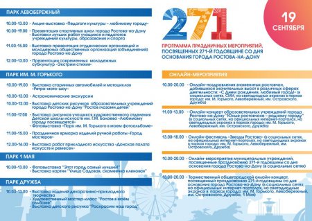 В ближайшие выходные, 19 и 20 сентября, донская столица отметит день города. Однако из-за ограничительных мер, введенных в связи с пандемией коронавируса, праздник пройдет в онлайн-формате, а часть ключевых мероприятий будет вообще отменена. Об этом сообщила Администрация Ростова-на-Дону.