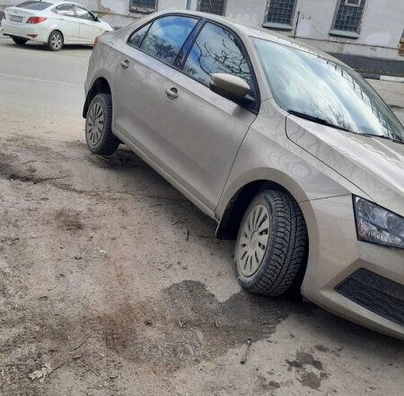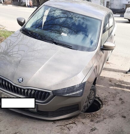 Водитель «Шкоды Рапид» хотел припарковаться на парковке у больницы, в районе шлагбаума. Но полностью занять парковочное место автомобиль не смог – колесо увязло в открытом люке, а бампер встрял в асфальт.