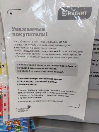 В первые дни марта ряд торговых сетей ввёл ограничение на продажу социально значимых товаров в одни руки. Речь идёт о сахаре, масле, муке, крупах и других продуктах. Такое решение продиктовано тем, что в последнее время участились случаи скупки определенных продуктов питания перекупщиками.