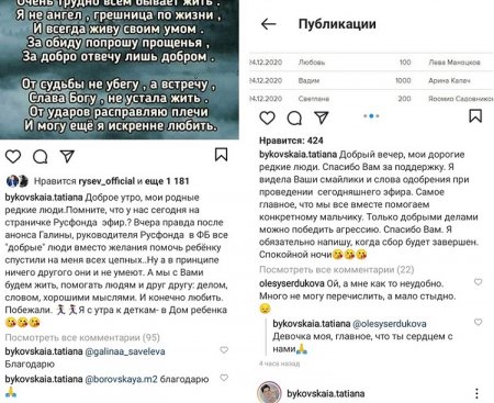 - «Добрые» люди вместо желания помочь ребенку спустили на меня всех цепных. Ну а в принципе ничего другого они и не умеют. А мы с вами будем жить, помогать людям и друг другу: делом, словом, хорошими мыслями. И, конечно, любить. Побежали. Я с утра к деткам – в Дом ребенка, - отреагировала на критику Татьяна Быковская.