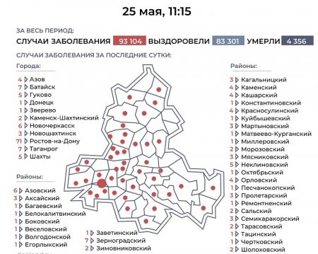 Больше всего новых случаев зафиксировали в Ростове, Батайске и Таганроге. На 25 мая от ковид скончались12 пациентов.