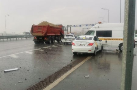 Брэндированный «Хендэ Солярис» на полном ходу врезался в машину ДПС («Форд Фокус) и микроавтобус Ространснадзора («Форд Транзит»). Служебные автомобили были припаркованы на дороге и осуществляли надзор за движением на этом участке трассы.