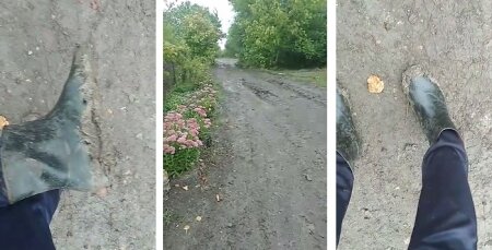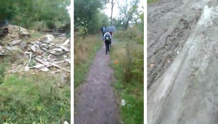 Преодолев грязевое месиво, школьники идут на остановку буквально «козьими тропами» – узкой тропинкой, где едва расходятся два человека. Кроме всего прочего, «обочины» «тротуара» усеяны горами строительного мусора. Его сюда свозят черные возчики.