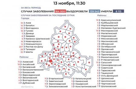 Новые данные регионального Роспотребнадзора 13 ноября свидетельствуют о 657 заболевших коронавирусом в регионе за последние сутки. Общее количество заразившихся за весь период пандемии составило на сегодняшнюю дату 164500 человек. Инфекция продолжает выявляться во всех городах и районах Ростовской области. Максимальное количество зафиксировано в Ростове (207), Волгодонске (33), Шахтах (32), Таганроге (28), Аксайском (18) районе и Гукове (16). В Батайске зафиксировано десять человек.