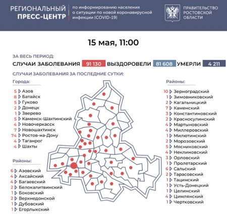 За последние сутки лидерами статистики заболеваемости COVID-19 стали следующие города и территории: Ростов (74), Зерноградский район (10), Батайск (8), Новошахтинск (7), Каменск (7), Азовский район (6). Всего инфекция была выявлена санитарной службой в 40 городах и районах региона.