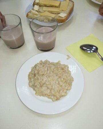 В школе №12, если верить фотографиям, дети едят с удовольствием даже кашу. Так, 18 сентября в меню на завтрак была овсянка, какао, хлеб с маслом и сыром. Правда, напиток почему-то налит только до половины стакана, хотя в меню размер порции указан 200 г.