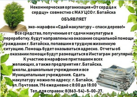 Акция проводится некоммерческой организацией "От сердца к сердцу" совместно с ЦСО Батайска. К участию в марафоне по сбору макулатуры приглашаются все желающие батайчане, а также предприятия города, школы, детские сады и все муниципальные учреждения.