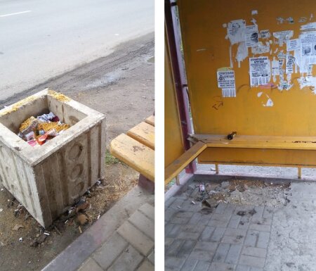 Сфотографировала женщина и саму остановку. Очевидно, что, хоть и установленную в советское время, конструкцию относительно недавно приводили в порядок. Как минимум, красили. Однако «заботливая рука» населения вновь наклеила объявления, набросала окурков и оставила бутылки. Причем скамьи не пригодны для пассажиров – сидения в пыли и в грязи.