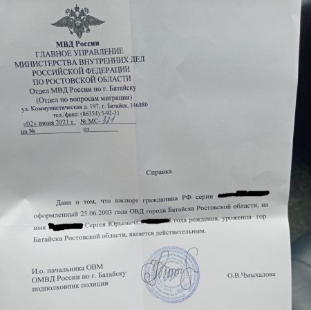 Чтобы решить проблему, кассир отправила его в паспортный стол на улице Коммунистической, 197 (Отдел по вопросам миграции ОМВД России по г. Батайску). Там нужно было взять справку о том, что паспорт все-таки действительный.