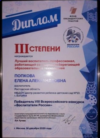 Победителем VIII всероссийского конкурса «Воспитатели России» стала сотрудник детского сада №10 "Сказка" Елена Александровна Попкова. Она отмечена дипломом третьей степени в номинации «Лучший воспитатель-профессионал, работающий со здоровьесберегающей образовательной технологией».