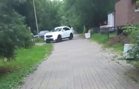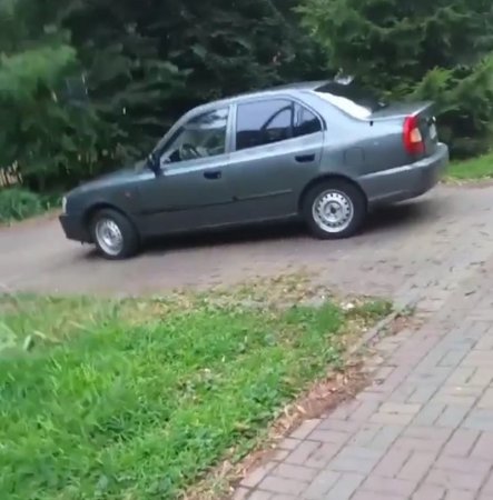 Две машины - белая "Инфинити" и серый "Хендэ" - проехали по пешеходным аллеям парка и припарковались возле бывшего кафе "Пеньки" (ныне "Грин парк"). При этом машины ловко лавировали между людьми.