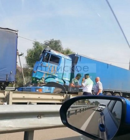 Девушка утверждает, что пробка образовалась на протяжении нескольких километров. Судя по всему водитель, управляющий «МАЗом», не выбрал безопасный интервал до впереди двигавшегося в попутном направлении «МАНа» и совершил с ним столкновение. На кадрах видно, что у врезавшегося большегруза сильно смят кузов.