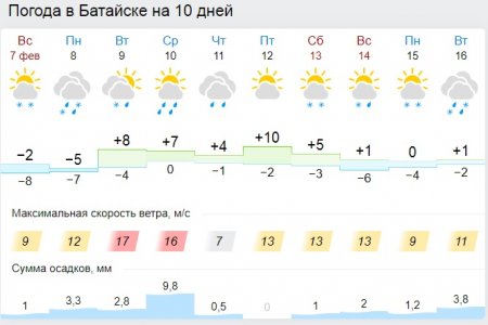 Сразу скажем – холодно будет только в понедельник – днем -5, ночью -7. А вот все остальные дни до конца недели батайчан ждет плюсовая температура. Максимальных значений она достигнет в пятницу, 12 февраля, когда столбики термометров поднимутся до +10 градусов. Ночные температуры будут колебаться около нуля.