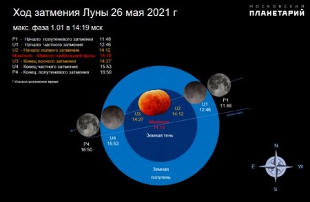 – 26 мая произойдут сразу три астрономических события, связанных с Луной: перигей, полнолуние и полное затмение Луны. Причем разница между первыми двумя составит чуть больше 9 часов! – общается на сайте планетария.