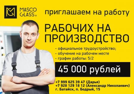 Федеральный производитель стеклопакетов компания «Masco Glass» открыл вакансию «рабочий на производство». Требуется сотрудник для работы на станках по производству стеклопакетов. Предприятие гарантирует обучение, рассматривает кандидатов без опыта работы.