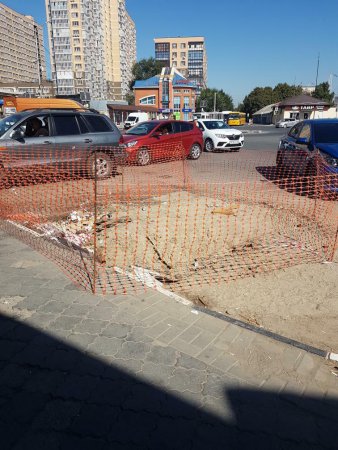 В Батайске возле хитрого рынка два месяца назад случился прорыв канализации. В месте порыва вскрыли асфальт и вырыли яму, да так и оставили. С тех пор, по словам батайчан, сотрудники водоканала периодически приезжают заменить ограждение и всё. В яме скопился мусор и даже трупы животных. Об этом 11 сентября рассказала Оксана Некрасова.