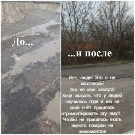 - Нет, люди, это я не хвастаюсь, это не моя заслуга. Подробности не знаю, но знаю, что у человека умерла жена и он нанял бригаду залатать дыры. Так сказали рабочие, которые ремонтировали эти ямы. У людей случилось горе, и им за свой счет пришлось отремонтировать эту яму. Чтобы не пришлось ехать вместо похорон на шиномонтаж. Живут они здесь недалеко, - рассказала Светлана.