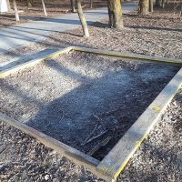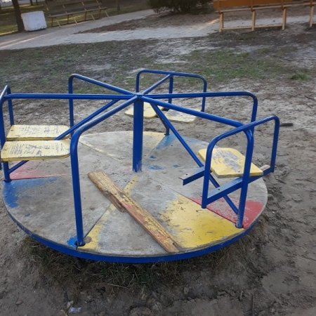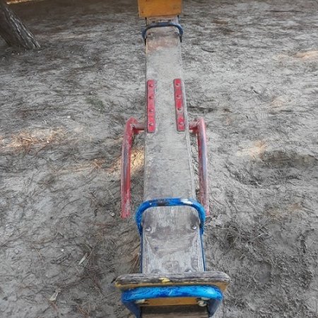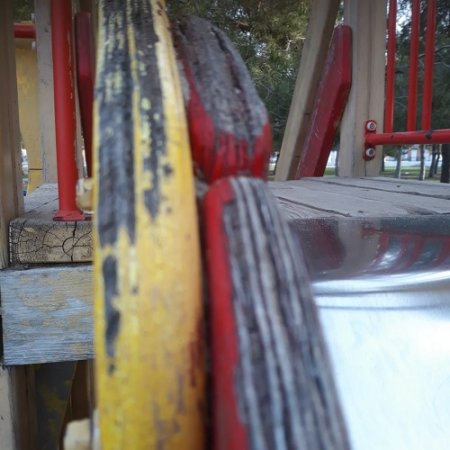 На всех других игровых объектах облупилась и стерлась краска. На горке разваливаются деревянные ступеньки. Песок из песочницы давно растащили, а там где он еще остался, лежат фекалии животных.