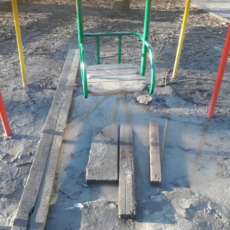 Судя по фотографиям, использовать качели и детские горки нельзя. На них легко можно получить травму. Но малышей в сквере много, и их родители как-то пытаются играть с детьми. Например, чтобы прокатить ребенка на качели, мамам пришлось закрыть под ней глубокую лужу. Для этого местные жители натаскали досок.