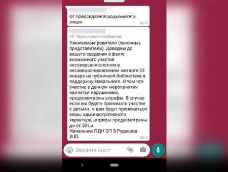 – Уважаемые родители (законные представители). Доводим до вашего сведения о факте возможного участия несовершеннолетних в несанкционированном митинге 23 января на публичной библиотеке в поддержку Навального. О том, что участие в данном мероприятии является нарушением, предусмотрены штрафы. В случае если вы будете принимать участие с детьми, к вам будут приниматься меры административного характера, штрафы предусмотрены до от 30 т.р..