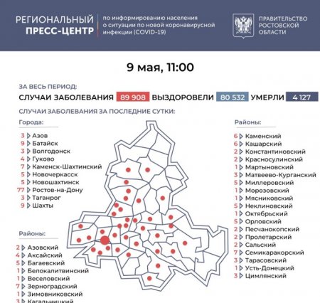Лидерами суточной статистики стали Ростов (77), Батайск (9), Шахты (9), Каменск-Шахтинский (7), Зерноградский (7) и Семикаракорский (7) районы. Всего инфекция была выявлена в 37 городах и районах Дона.