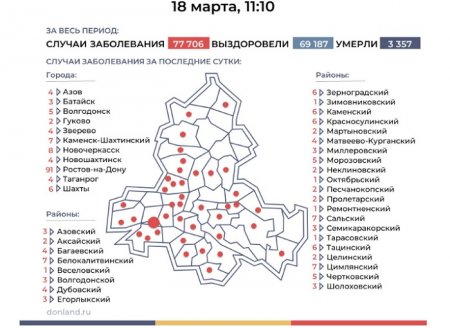 Как сообщает региональный Роспотребнадзор, по данным на 18 марта коронавирус выявлен в 40 городах и районах Донского края. Традиционно, максимальное количество больных зафиксировано в столице региона Ростове (91 новый заразившийся). Далее следуют Новочеркасск (8) и Каменске-Шахтинский (7). В Батайске были выявлены минимальны за последние недели значения статистики заболевших – три человека.