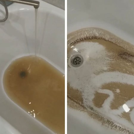 - А это я спустила воду – «идеальная» ванна, да? А главное – платите за водичку вовремя! И в этом мне надо ребенка купать? – говорит автор видео.