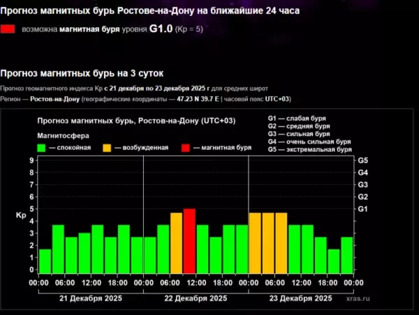 Специалисты предупреждают о предстоящих магнитных бурях. 22 декабря геомагнитная активность начнет расти уже с 6:00 , а к полудню достигнет уровня G1. Во второй половине дня обстановка станет спокойнее. Новый всплеск ожидается в ночь на 23 декабря. Буря продлятся с полуночи до 9:00, после чего магнитосфера начнет стабилизироваться и к 12:00 придет в норму.