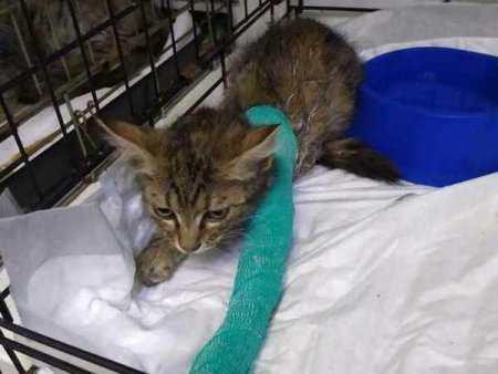 Животное пряталось в траве. Его удалось поймать и отвезти на рентген. Это оказалась молодая кошечка. От удара у нее вылетела коленная чашечка на передней лапе, раздроблена лопатка и порвано сухожилие. Ветеринары говорят, что он не чувствует свою конечность и вряд ли когда-нибудь будет ею шевелить. Но они не сдаются.