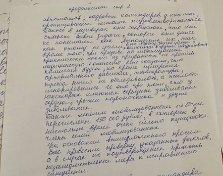 – Наших ребят не обучали, за исключением произвольной стрельбы из автоматов в течение двух дней, - говорится в обращении. – Кадровых офицеров нет, организованное питание неудовлетворительное. Им ставят боевые задачи, которые они даже не понимают, как выполнять, потому что их не учили. Кроме того, они не проходили медкомиссию.