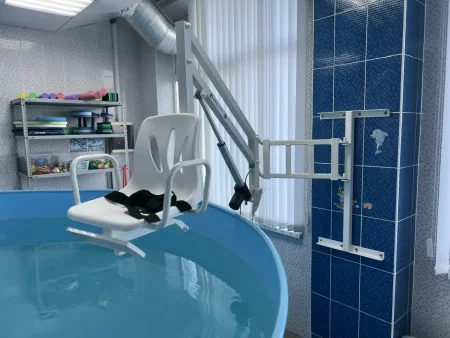 Подъемник помогает безопасно спускать детей в воду и поднимать их обратно. Он необходим для тех, кто не может передвигаться самостоятельно. Занятия помогают снять спастику мышц и полностью укрепить мышечный корсет всего тела.