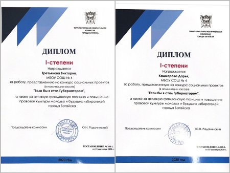 Территориальная избирательная комиссия Батайска подвела итоги городского конкурса социальных проектов. В номинации «Эссе: если бы я был губернатором» победили сразу две 11-классницы из школы №4: Виктория Третьякова и Дарья Кашкарова. Всего же в нем приняли участие 13 учеников из семи школ.