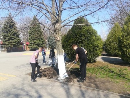 Ученики девятых и десятых классов убирали грязь, белили деревья, красили урны и вскапывали землю. А после субботника отправились учиться - уроки в этот день не отменили, а сдвинули.