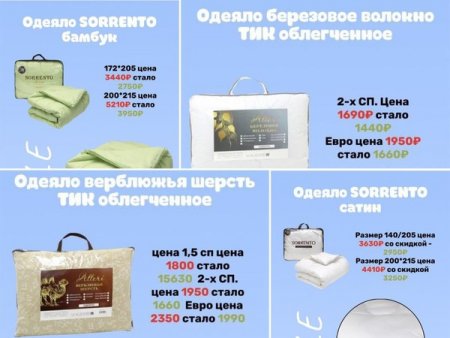 Склад-магазин «Матрасы» в Батайске вновь проводит акцию для покупателей в связи со сменой сезона. Скидка на все одеяла от 15 до 50% с 15 по 31 марта.