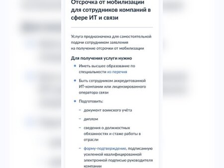 С 28 сентября на портале Госуслуг заработал сервис по подаче заявления на отсрочку от частичной мобилизации. Там можно ознакомиться с полным перечнем категорий граждан, которые подлежат отсрочке. Как ранее сообщало Министерство связи и цифрового развития.В списке есть 195 наименований специальностей в сфере ИТ и связи – от физики до строительства.