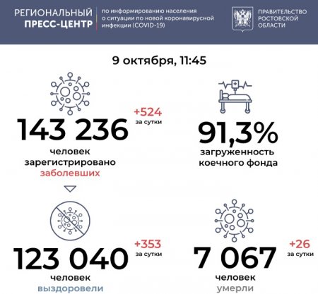 Региональный Роспотребнадзор 9 октября сообщил о 524 заразившихся COVID-19 за сутки. Количество инфицированных стало самым высоким за весь период пандемии коронавируса в Ростовской области. Для сравнения: 8 октября стало известно о 523 заболевших, 7 октября – о 515, а 6 октября о 514 новых пациентах.