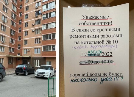 В начале прошлой недели на подъезде многоэтажки по Северной Звезде, 2, в Батайске появилось объявление. Листок гласил, что из-за аварии на теплотрассе не будет горячей воды. Первоначальный срок один день был изменен УК на неопределенное «несколько дней».