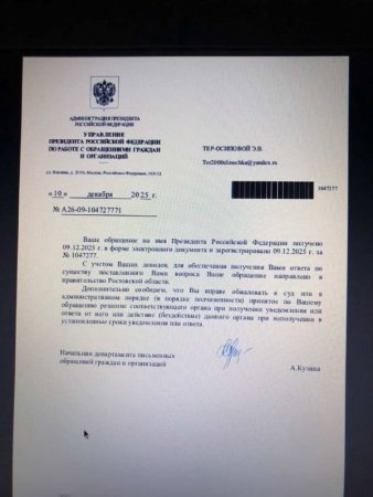Женщина просит главу государства разобраться с ситуацией в Батайске и усилить контроль за работой местных властей.