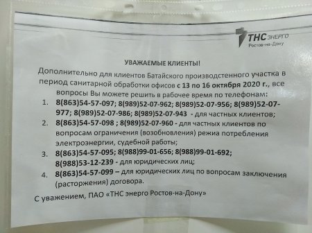 - Из-за ухудшения ситуации с COVID-19 все офисы обслуживания ПАО «ТНС энерго Ростов-на-Дону» в Ростовской области, в том числе и Батайский ПУ, с 13 по 16 октября будут закрыты на санитарную обработку, - прокомментировало ведомство.