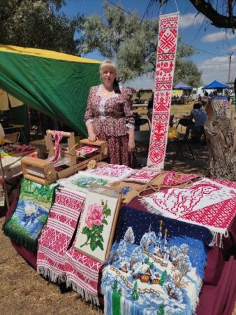 Руководитель творческой мастерской "Аксинья" при городском культурно-досуговом центре Анжелика Задорожняя привезла на фестиваль свои работы – собственноручно сотканные гобелены и малый ткацкий станок для демонстрации народного ремесла. Большой интерес у гостей фестиваля вызвала работа за станком и плетение шнуров на ромашке.